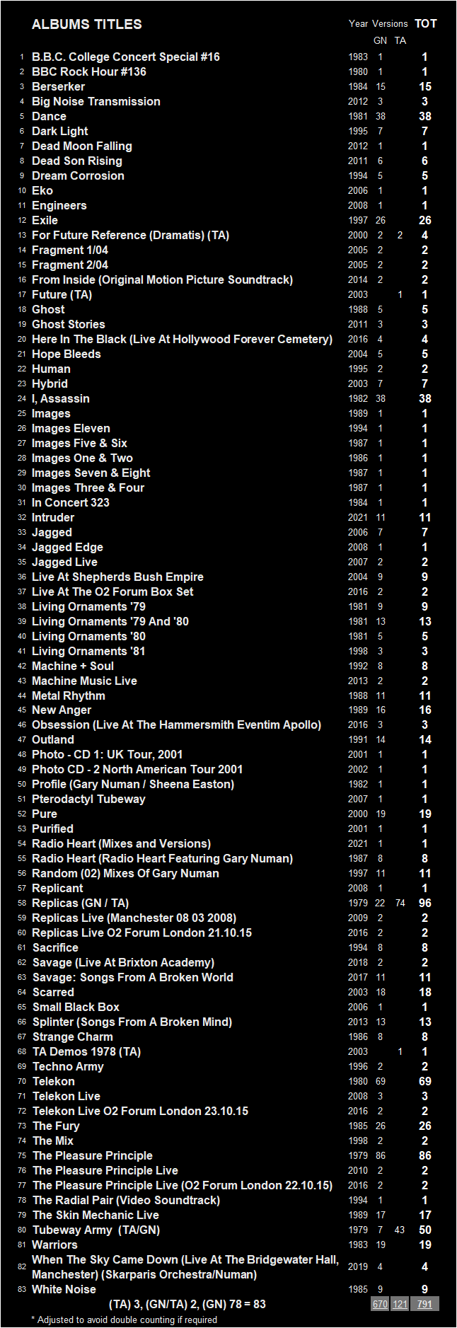 These are the ALBUMS accredited to Numan and the collaborative artist names used in this Chartography (see here for names)
