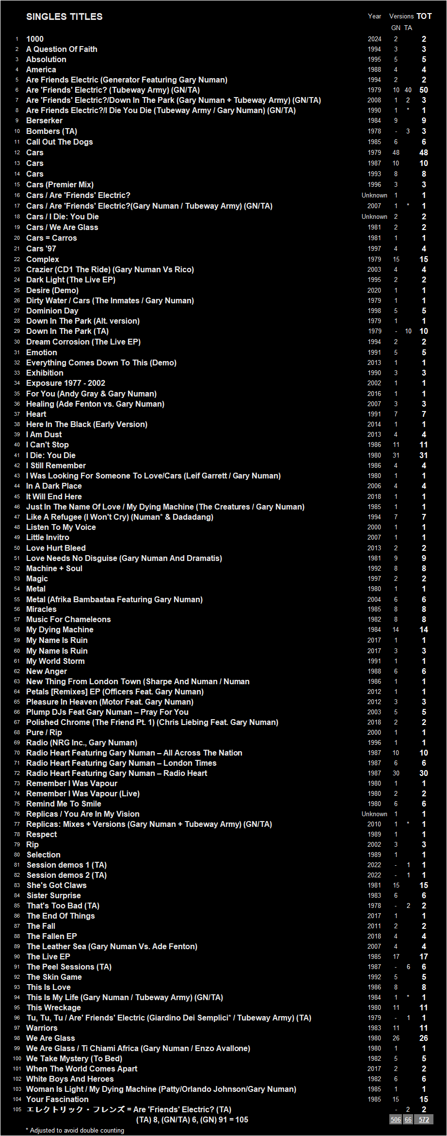 These are the SINGLES / EPs accredited to Numan and the collaborative artist names used in this Chartography (see here for names)