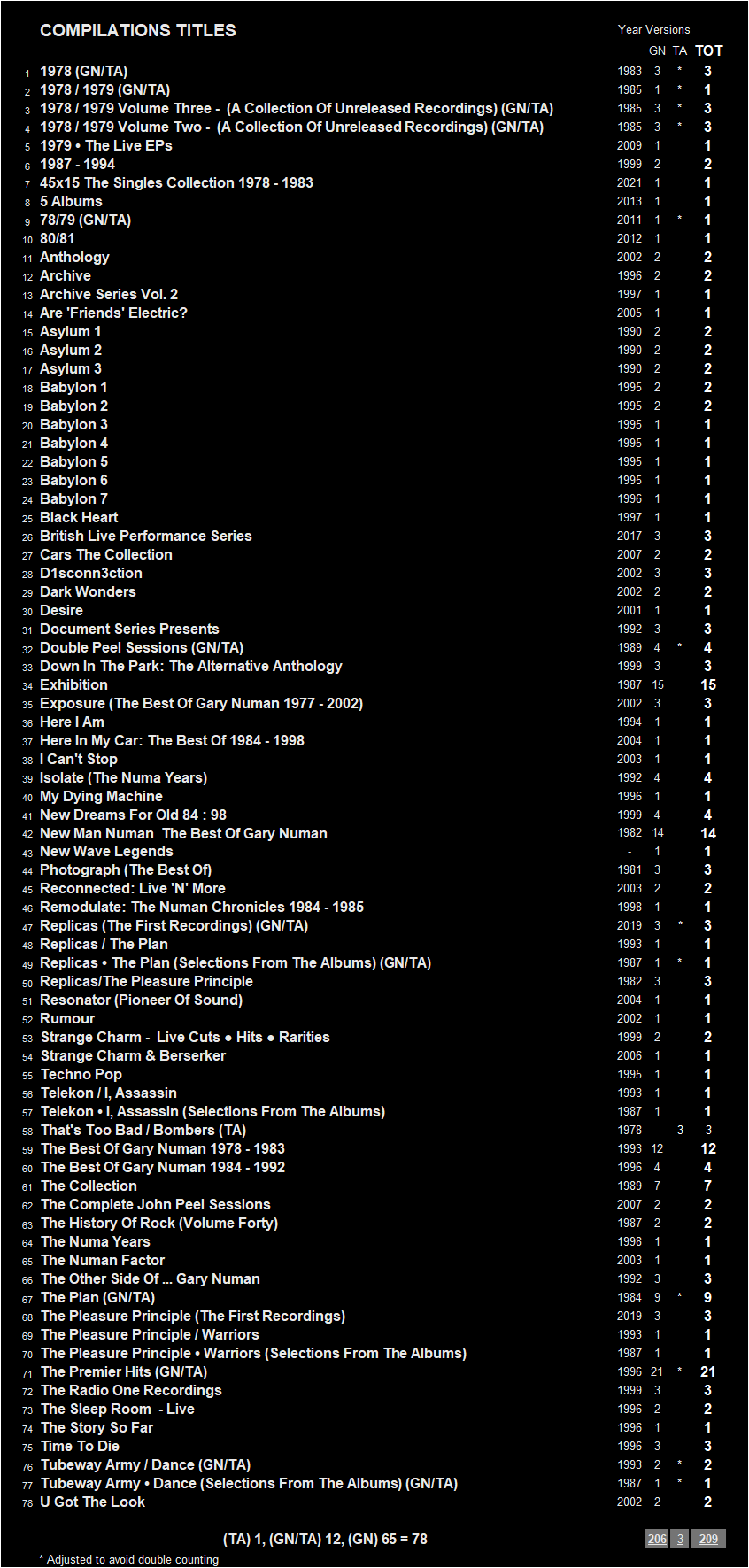 These are the COMPILATIONS accredited to Numan and the collaborative artist names used in this Chartography (see here for names)